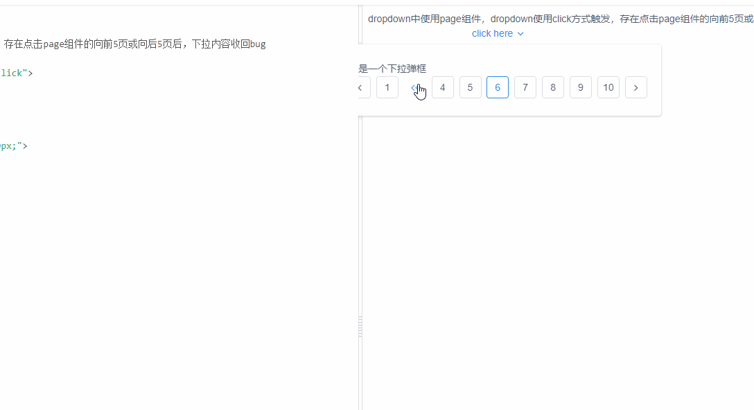 问题的表象很简单,使用的是组件库的下拉弹窗组件,在组件中使用到了分页组件,当点击分页组件的向后 5 页快速跳转时,弹窗被收回了。我们的预期是能够继续操作的,只有点击弹框外部时,弹窗才会被收回。